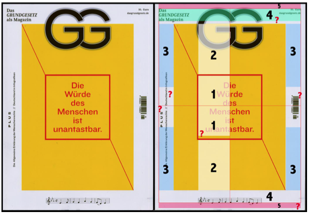 Nenn mich einen Krümelkacker, aber es fängt bereits mit der Titelseite an. Wir sehen (rechts in der Spalte oben) links das Original und rechts eine sozusagen vermessene Version, in der die je mit Zahlen unterschiedenen Flächen jeweils gleich gross sind.