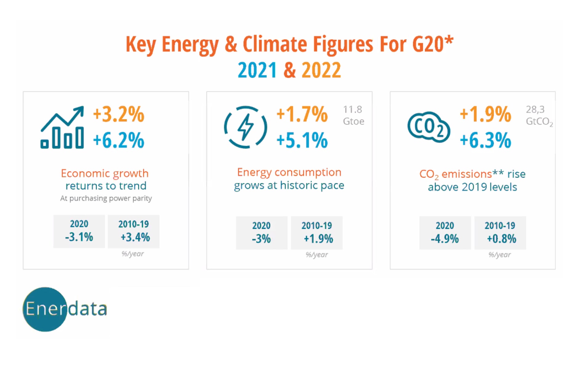 Im Juni 2020 hatte ich erstmals von der jährlichen Enerdata-Präsentation berichtet, soeben wurden die aktuellen Daten vorgestellt. Sie „ernüchternd” zu nennen wäre einem Optimismus geschuldet, für den die Daten keinen Anlass geben. Wir sind nunmehr im achten Jahr nach Abschluss des Pariser Vertrages und trotz der allgegenwärtigen Kommentierung und Berichterstattung zum Klimawandel ist eine Trendumkehr nicht in Sicht. Im Gegenteil: Nach dem ökonomischen Jojo in der Folge der Corona-Pandemie zeigen die globalen Daten den „Return to Historic G20 Economic Growth” und, damit verbunden, einen weiteren Anstieg der Emissionen.