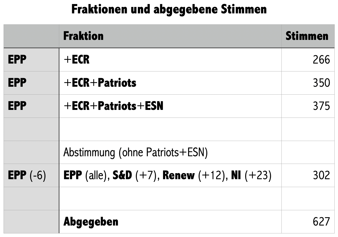Will Manfred Weber im Europäischen Parlament eine Verordnung durchbringen, braucht er eine Mehrheit und zwar die Mehrheit der abgegeben Stimmen (nicht: der Mitglieder des Parlamentes). Eben darin liegt ein unberechenbares Risiko, denn bei der „Mehrheit der abgegebenen Stimmen” ist vor der Abstimmung unklar, wieviele Stimmen genau es brauchen wird. Bei der hier infrage stehenden Verordnung wurden 627 Stimmen abgegeben (… offenbar war das Parlament nicht vollständig versammelt; einige mochten „offiziell verhindert” gewesen sein, andere werden sich schlicht gedrückt haben; dazu später). Der Vollständigkeit halber: Bevor eine Verordnung „unmittelbare” Wirkung erlangt (=Gesetzeskraft), muss sie (nach Art 294.13 AEUV) nach dem Parlamentsbeschluss eine qualifizierte Mehrheit im Rat (das ist nicht: die Kommission) finden; insofern ist die Parlamentsabstimmung notwendig aber nicht hinreichend.