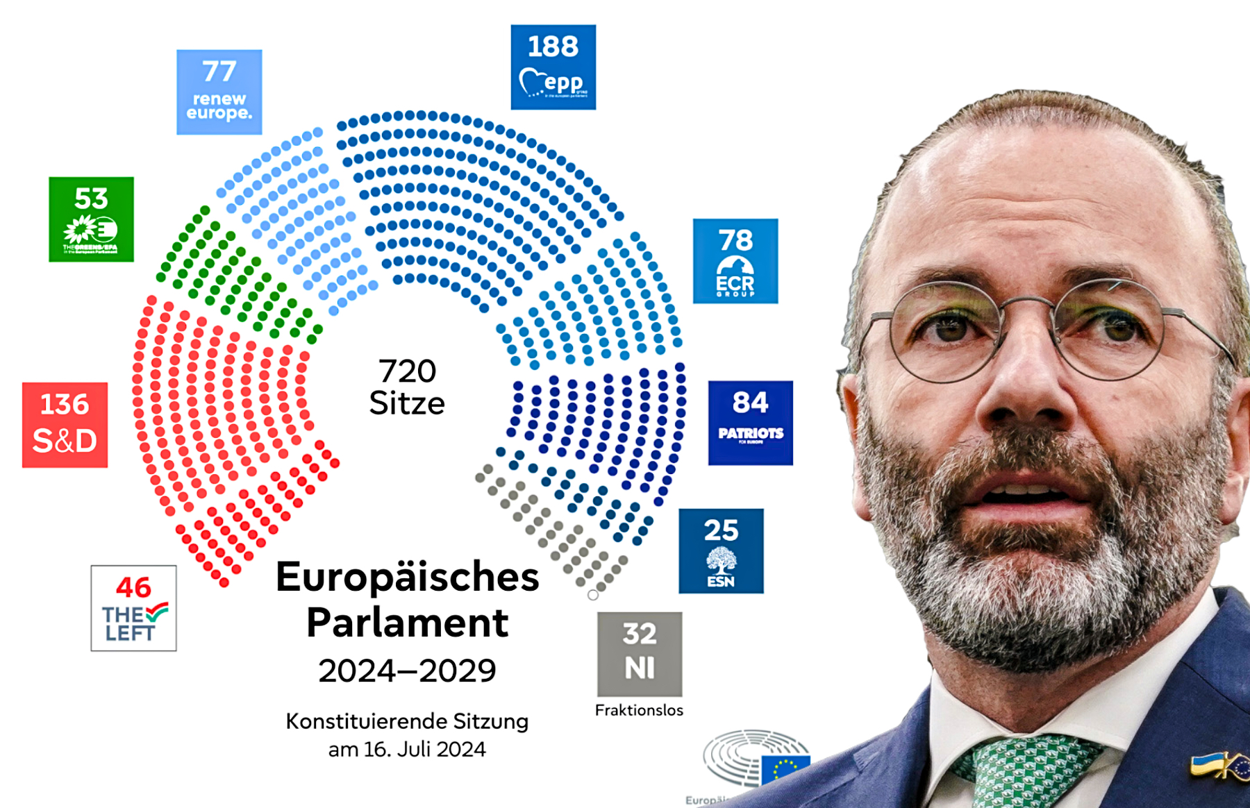 Manfred Weber, CSU-Mitglied, führt die EPP-Fraktion im Europäischen Parlament – und vermutlich ist er die massgebliche (europäische) Stimme im konservativen Lager, dem die EPP und die ECR wohl zusammen zugerechnet werden können. Weiter rechts wohnen die Patrioten (geführt von Jordan Bardella vom französischen Rassemblement National) und so weit aussen, dass selbst die Franzosen nichts damit zu tun haben wollen, finden sich der/die/das ESN (die mehrheitlich aus der AfD bestehen).