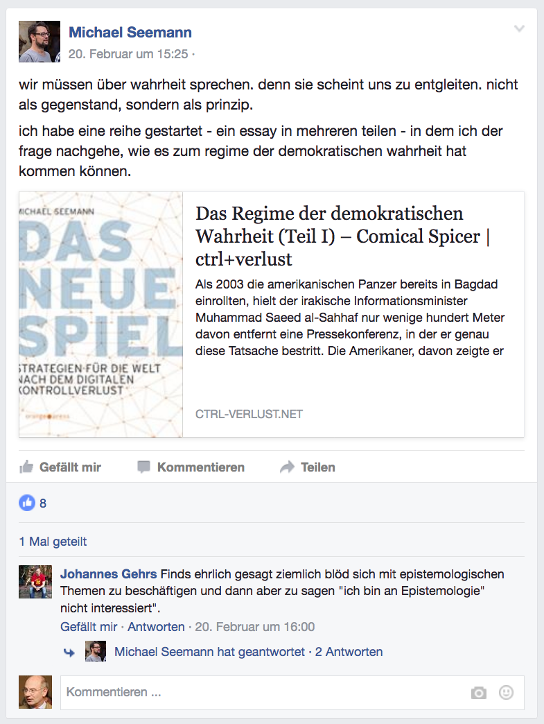 Michael Seemann hat den ersten Teil eines Essays öffentlich (hier) gemacht, in dem es um „die Wahrheit“ geht. Insofern noch mehrere Teile dieses Essays ausstehen, lässt sich über den Gehalt seiner Überlegungen noch nichts Abschliessendes sagen.
