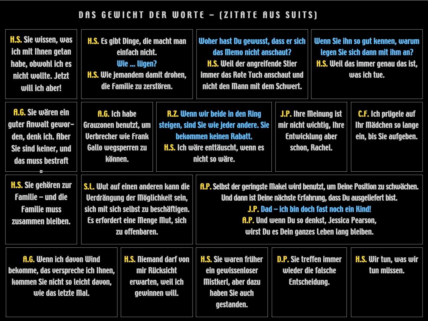 Im Verlauf der Serie – ursprünglich ausgestrahlt 2011 bis 2019 – durchlaufen die Charaktere … Entwicklungen, körperlich: sie werden älter, in der Persönlichkeit und auch in den Beziehungen zueinander. Abgearbeitet wird das an wiederkehrenden Fragen: wie in jedem Hinterhof eine US-Fahne flattert, erfahren wir Zuschauer in jeder Folge drei bis fünfmal, „Ich bin …[je nach dem] Senior Partner, Namenspartner, geschäftsführender Partner“, für den Fall, dass irgendwer das in den letzten 5 Minuten vergessen hätte. Zumeist verbindet sich damit die Nachricht „oben sticht unten“, die ist eigentlich keine, nur wird das hier jeden Tag neu verhandelt. Im Übrigen kreisen die Themen darum, wer wen liebt oder respektiert, belügt oder verrät (überwiegend: in Tateinheit), wer wen über den Tisch zieht, in die Pfanne haut oder – bevorzugt – ein für alle Mal vernichtet, ob es Rachel gelingen wird, einen ihre Intelligenz stützenden Machismo zu entwickeln und schliesslich, ob es für Harvey neben Donna jemals eine andere Frau geben kann, was, spoiler alert, nicht der Fall ist.
