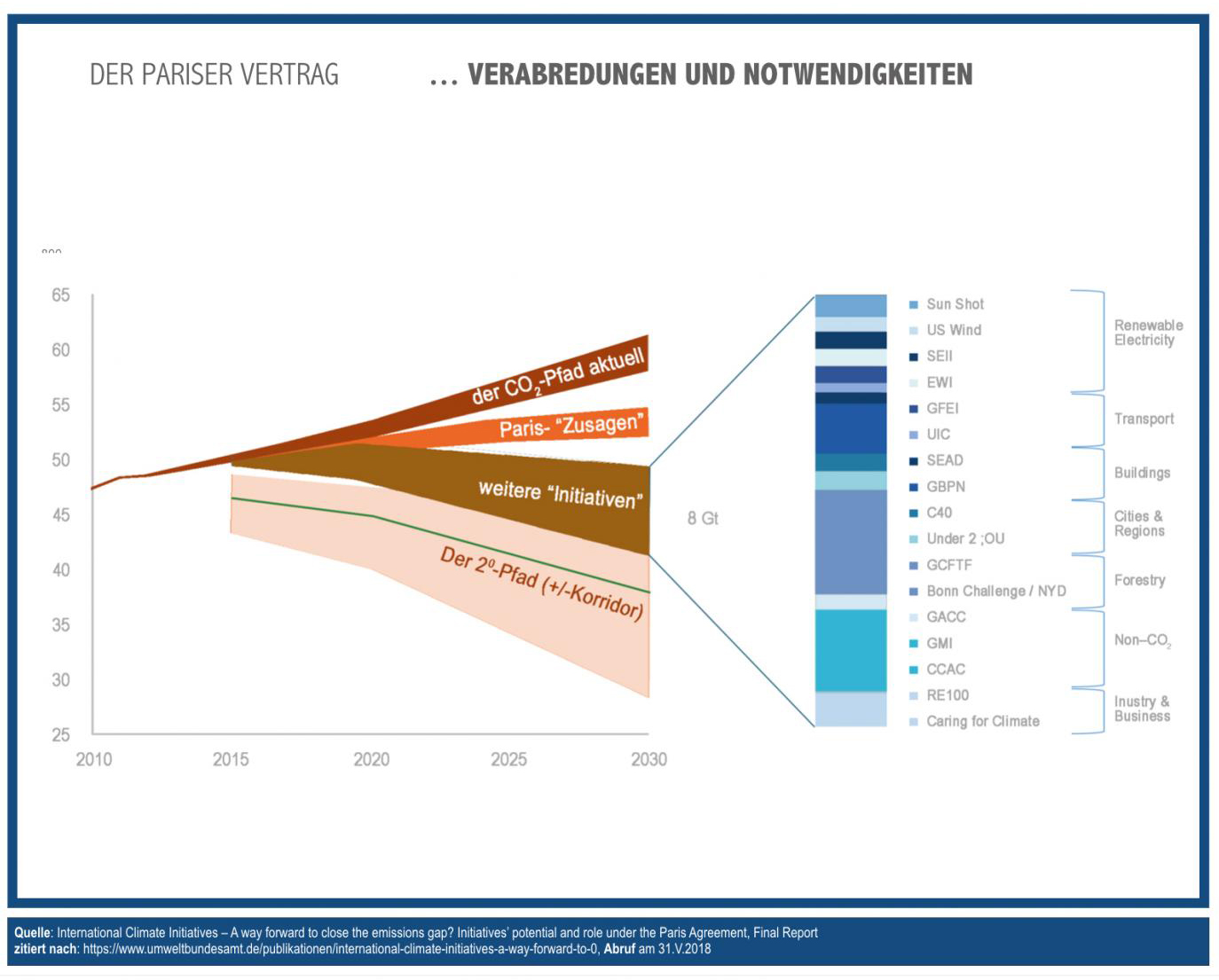 die Tatsache, dass a) die in COP21 (der „Pariser Vertrag“ von 2015) vereinbarten Massnahmen nicht eingehalten werden (das ist, leider, ein Indikativ! – auf globaler Ebene steigen die CO2-Emissionen anstatt zu sinken). Doch damit nicht genug: Überdies sind b) die Massnahmen des Pariser Vertrages um einen Faktor 2 oder 3 zu klein geraten sind, um, würden sie denn eingehalten, das 2-Grad-Ziel zu erreichen. Dazu bräuchte es weitere „Initiativen“, die übrigens „freiwillig“ sind und nicht Gegenstand des Pariser Vertrages.
