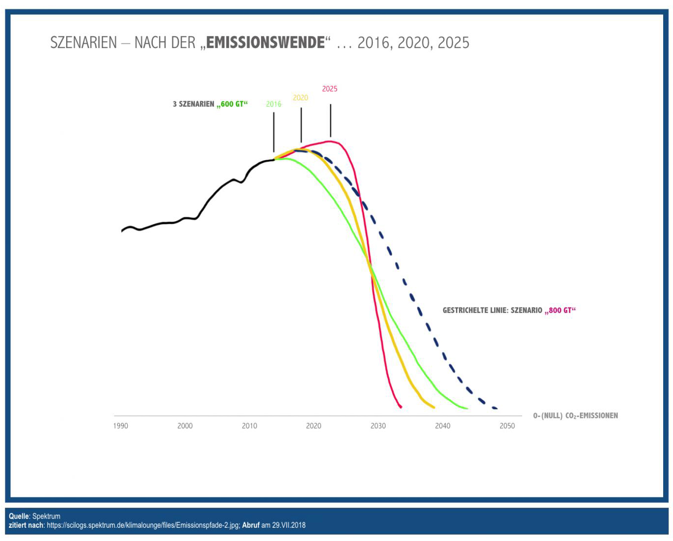 Die hier abgebildeten Kurvenverläufe zeigen, in welchem Tempo – in Abhängigkeit vom Zeitpunkt der tatsächlich wirksamen Emissionswende – die globalen CO2-Emissionen auf Null reduziert werden müssen. Schon heute ist klar, dass die beiden ersten Trend-Umkehrpunkte (2016, 2020) verpasst wurden (auch wenn 2020 noch Zukunft ist: nichts deutet darauf hin, dass die tatsächlichen Massnahmen auch nur in die Nähe dieses tipping points führen). Die Folge dieses Verfehlens ist, dass nach einer Trendwende ( vielleicht um 2025 herum – eine, Stand heute, vor allem mit Blick auf die sogenannten Entwicklungsländer überaus optimistische, wenn nicht illusorische Prognose) für das Erreichen der 0-Linie nur 10 Jahre verbleiben.