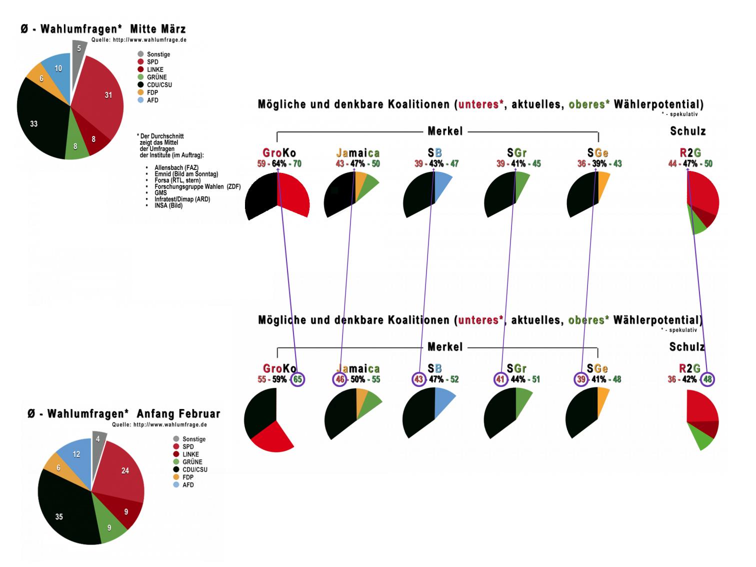 Vom politischen Personal war bereits die Rede (siehe timelabs.de/Blog). Inzwischen hat die SPD meine Vermutungen bestätigt, und Martin Schulz hat gezeigt, dass er seine Partei zu versammeln weiss. Doch wie sagte der Freund nach Schulzens Rede im Willi Brandt-Haus: „Der kann Vizekanzler“. Ja, mehr war das noch nicht. Entscheidend aber ist (auch wenn wir gerne anders glauben und auch entscheiden): eine Personenwahl findet nicht statt. Das Kandidat hat stets auch eine Partei im Gepäck, und, wie die Dinge liegen, mehr als nur eine.