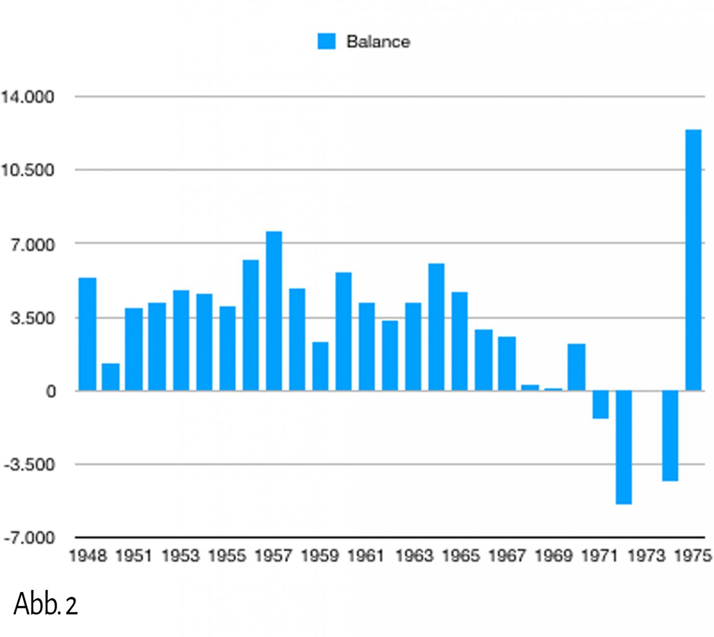 Abb. 2 zeigt übrigens die US-Handelsbilanz aus den Jahren 1948 bis 1975, in Summe ein Überschuss von ~85 Mrd. Dollar, von denen zwischen einem Drittel (24 Mrd.) und zwei Fünfteln auf Exporte nach Europa entfielen. Man könnte also durchaus sagen: der Marshall-Plan hatte sein Geld gut investiert [qtip:(5)|mit ein wenig sarkastischer Phantasie bei der Übersetzung nennen wir vergleichbare Vorgänge heute „Audience Development“].