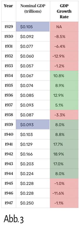 „The economy recovered from the Depression only with the advent of World War II which pushed demand for goods and services to the limit of its capacity.“ (Quelle)