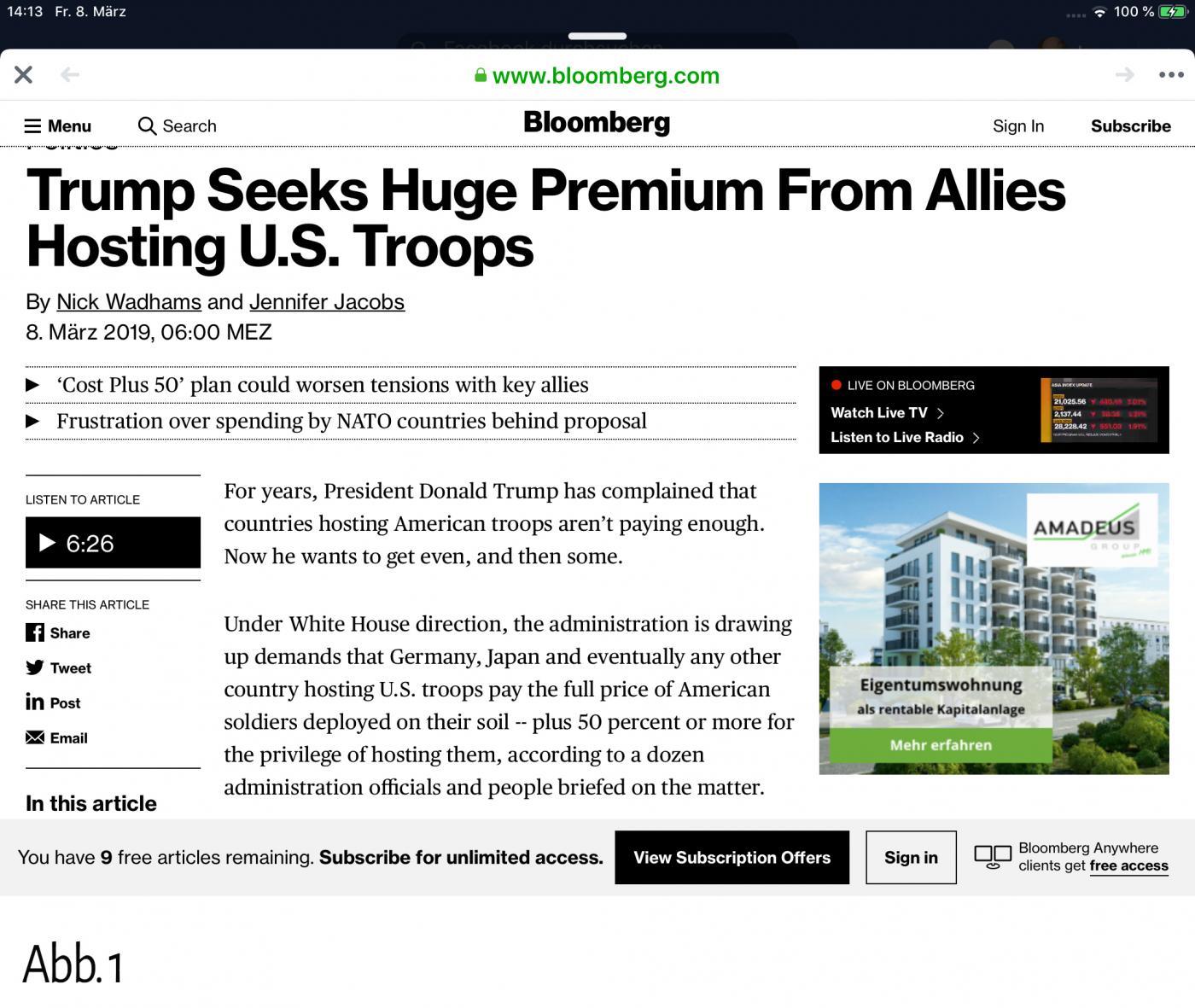 Dass die NATO als solche zur Diskussion [qtip:(0)|ich schliesse hier an meinen früheren Post an] steht, pfeifen die Spatzen. Jetzt ist Herr Trump auf die Idee gekommen (Abb. 1), dass die NATO-Partner dafür zahlen sollen, dass die USA ihre Interessen in Europa schützen und ihre Soldaten in ihren Partner-Ländern stationieren.